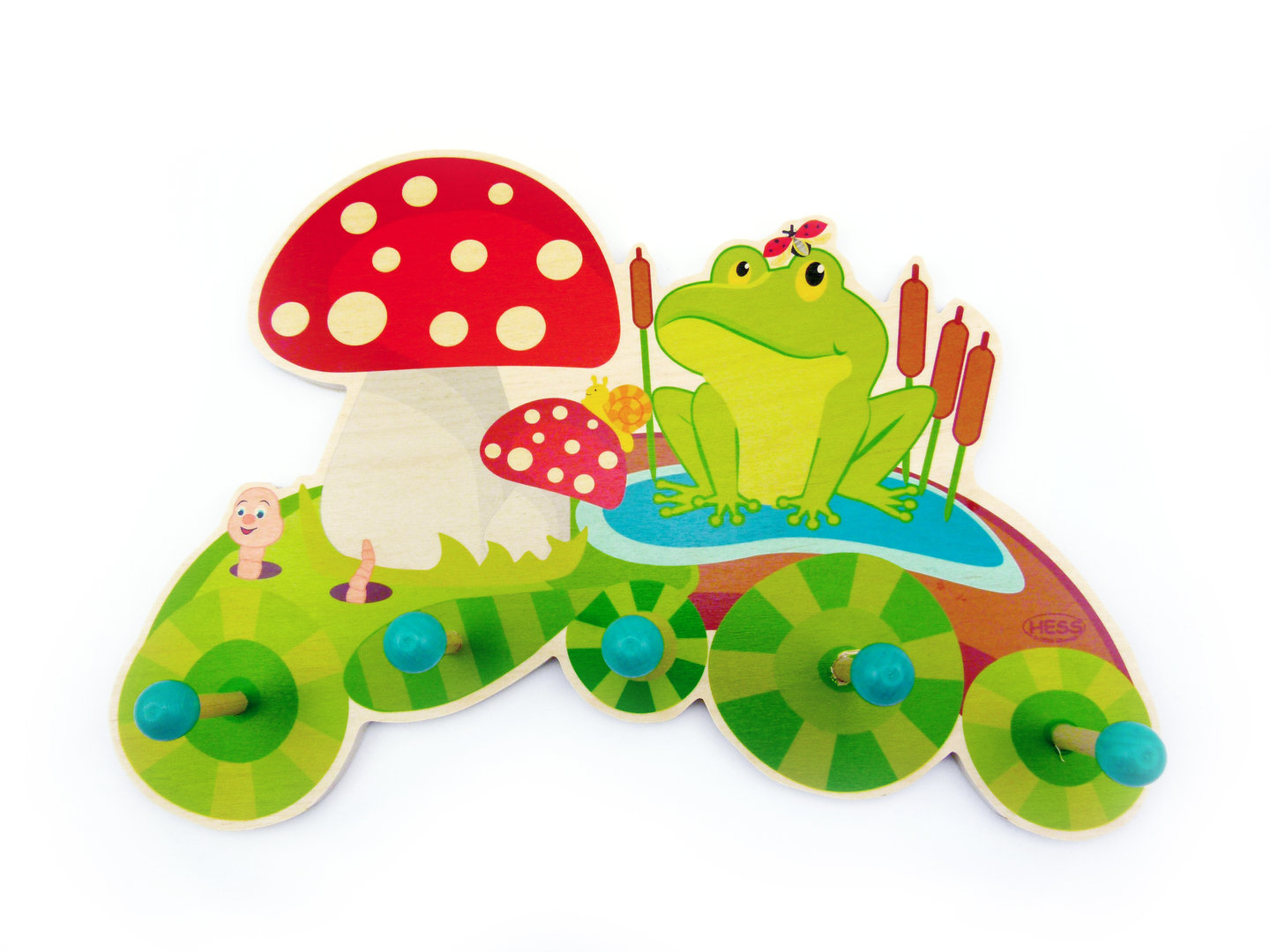 Een grote kikker met een vlinder op zijn hoofd kijkt naar de mooie paddenstoel. Deze kinderkapstok van Hess is voorzien van 5 stevige haakjes, dat zorgt voor een opgeruimde kamer.