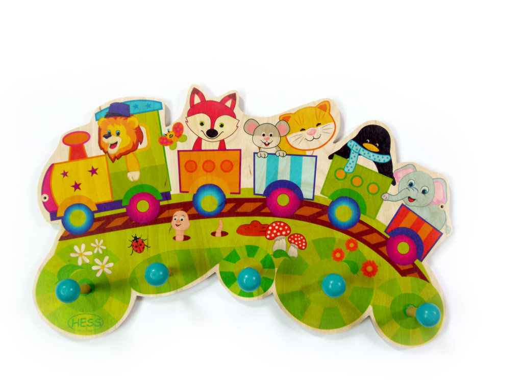 De machinist van deze trein is een leeuw, met als passagiers in de wagonnetjes een vos, een kat met muis, een pinguïn en een olifant. Deze kinderkapstok van Hess met 5 stevige haakjes zal goed passen in de kinderkamer.