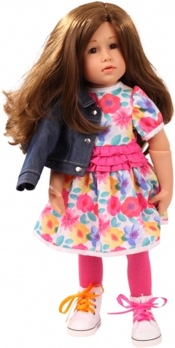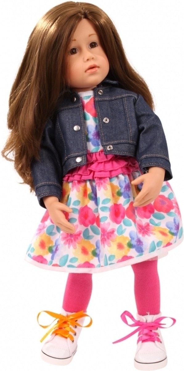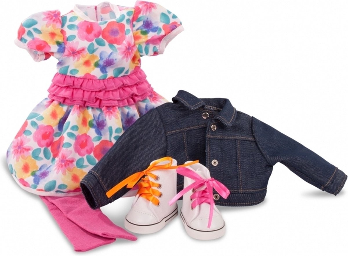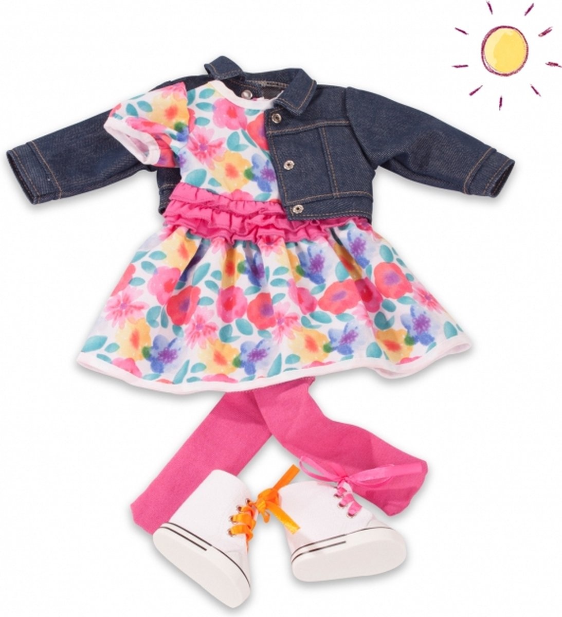 Leuke kledingset voor de Götz Girls 45-50cm De set bestaat uit een gebloemde jurk met ruches en tules aan de onderkant, roze maillot, spijkerjasje en sneakers met tweekleurige veters.