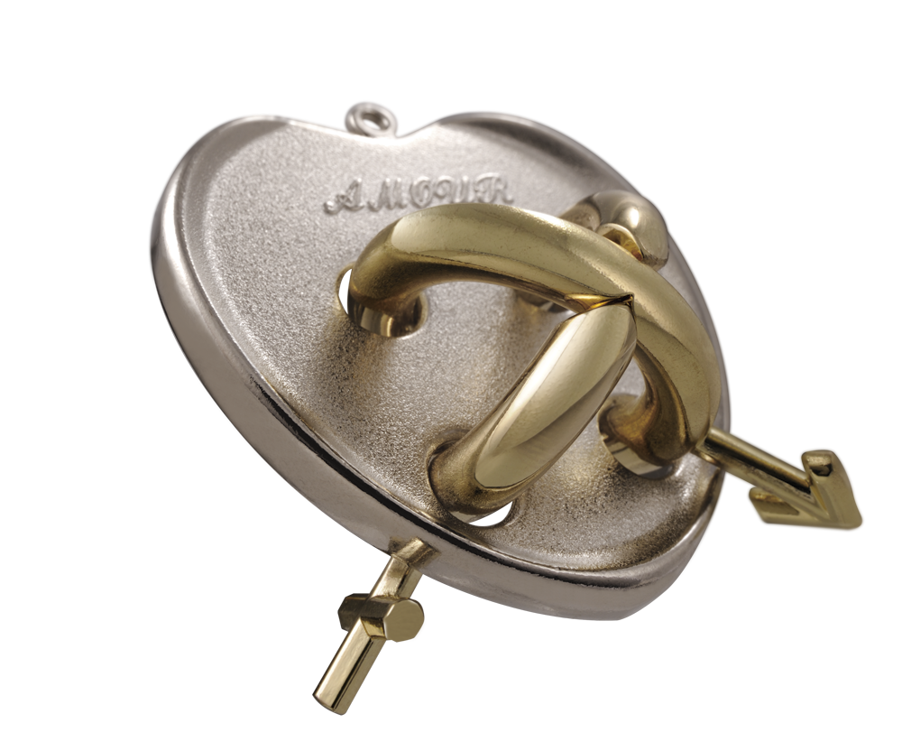 A masterpiece by metal smith Akio Yamamoto, the key word for this puzzle is “love.” The two separate, linked loops make this puzzle extremely challenging. The objective is to remove the masterfully united “Adam” and “Eve” loops