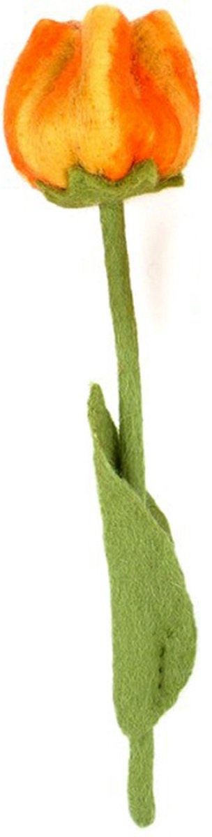 Deze vilten tulp van Sjaalmetverhaal is 32 cm lang en heeft een groene steel met een geel/oranje bloem. Wordt per stuk geleverd.