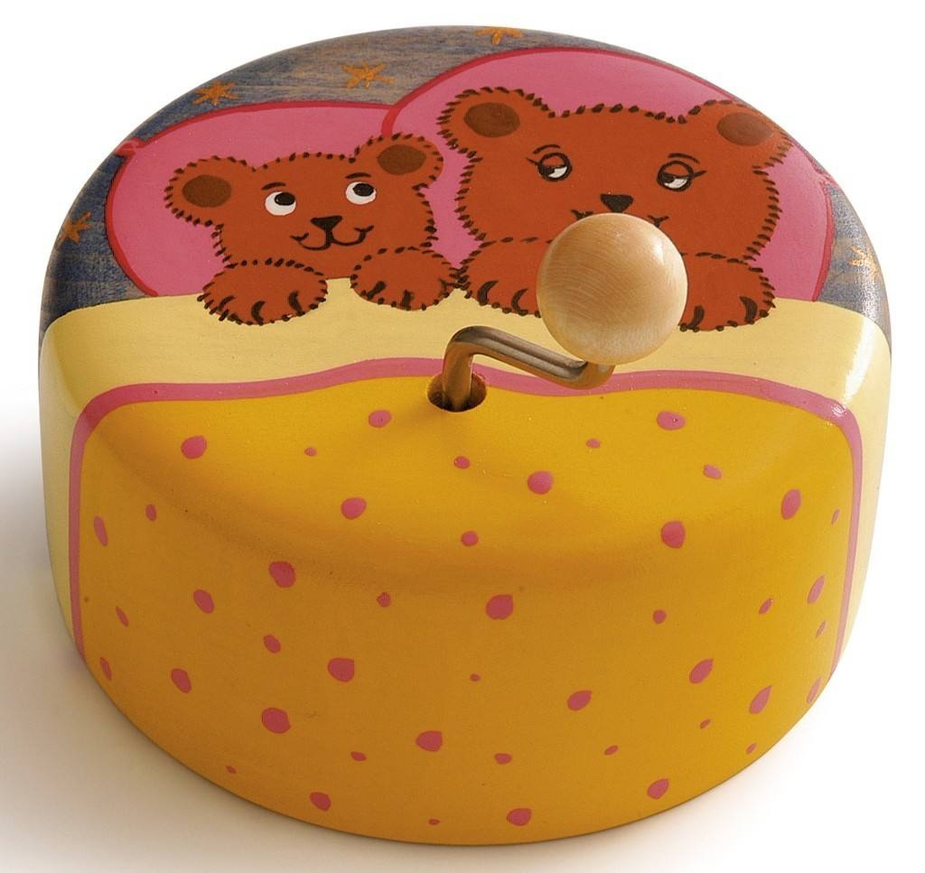 Een muziekdoosje met daarop een tweetal beren geschilderd die lekker willen gaan slapen onder hun warme dekentje. Hoor wat voor mooie melodie (La le lu) er gaat klinken als je aan de hendel gaat draaien. Hierbij valt de kleine zo in slaap.