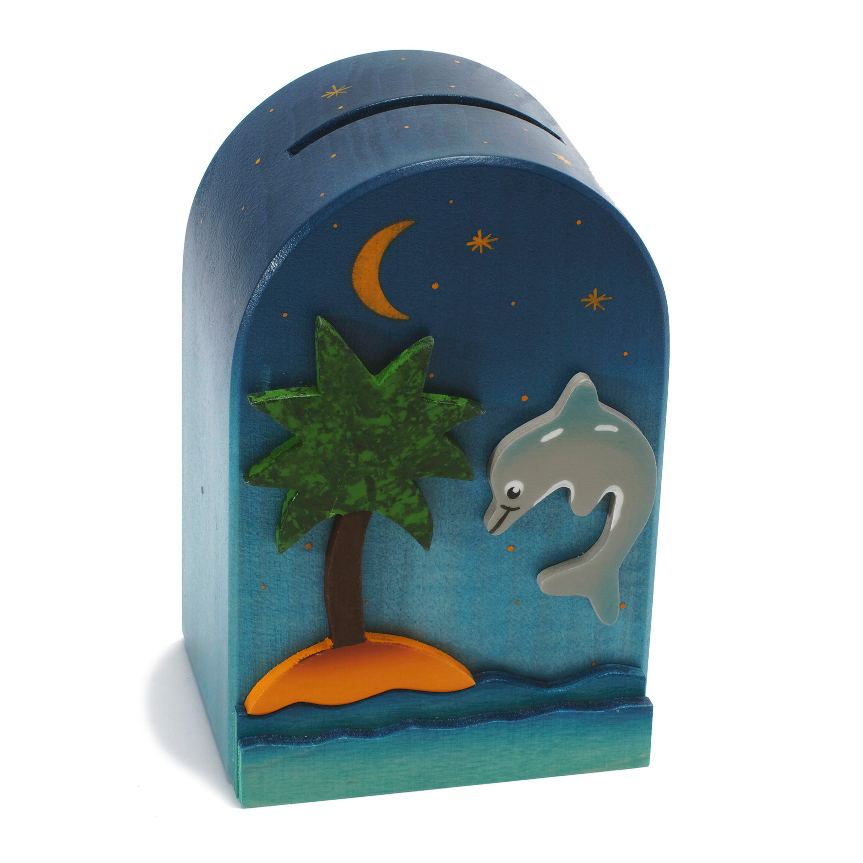 Een spaarpot van hout met daarop in verschillende lagen een tropisch eiland waar een dolfijn lekker aan het zwemmen is. Aan de onderkant is de mogelijkheid om met de meegeleverde sleutel de spaarpot open te maken.