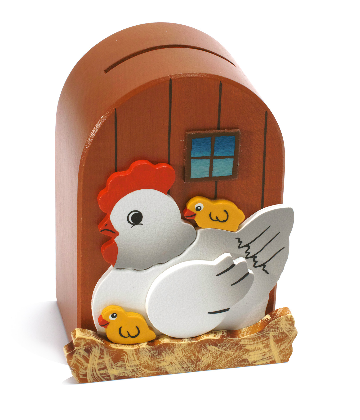 Een spaarpot van hout met daarop moeder kip met een tweetal kuikentjes bij haar in de buurt. Doordat er gewerkt is met verschillende laagjes hout geeft dit een 3D effect.